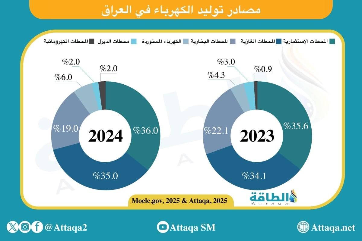 ويوضح الرسم التالي من منصة الطاقة، مصادر توليد الكهرباء في العراق، ومقارنة بين عامي 2023 و2024: