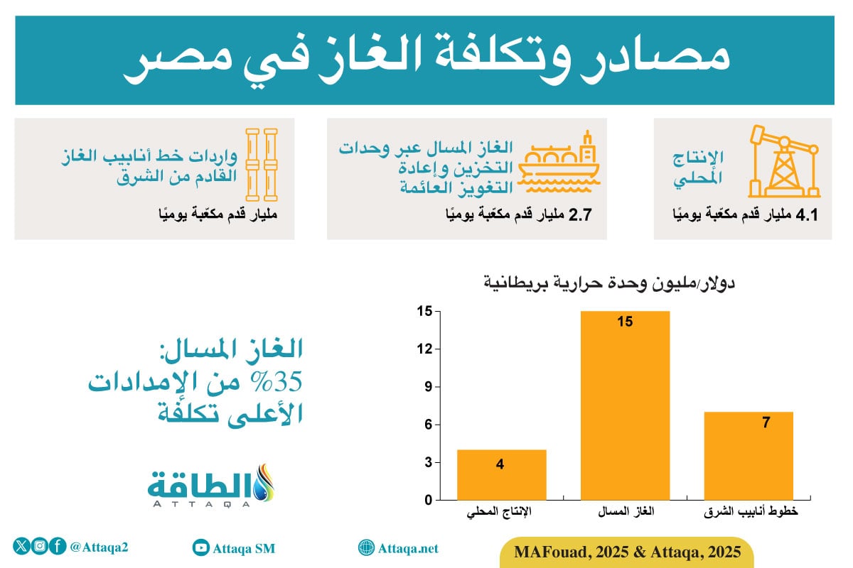 وجزء آخر عبر غاز الأنابيب القادم من الشرق بطاقة حالية تبلغ مليار قدم مكعبة يوميًا، وبتكلفة أقل تقترب من 7 دولارات، بينما يظل الإنتاج المحلي هو المصدر الأقل تكلفة عند نحو 4 دولارات.