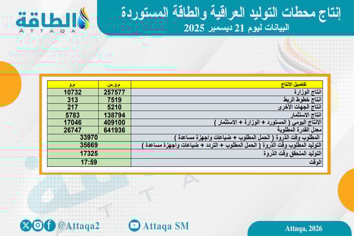 إنتاج محطات الكهرباء في العراق يوم 21 ديسمبر 2025
