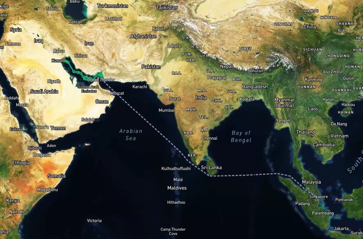 وبحسب بيانات منصة الطاقة المتخصصة (مقرّها واشنطن)، فإن الناقلة أوشن ثاندر Ocean Thunder -التي تحمل شحنة من خام البصرة الثقيل- مملوكة لشركة تركية، وفي طريقها إلى سنغافورة بعد عبورها المضيق بنجاح.